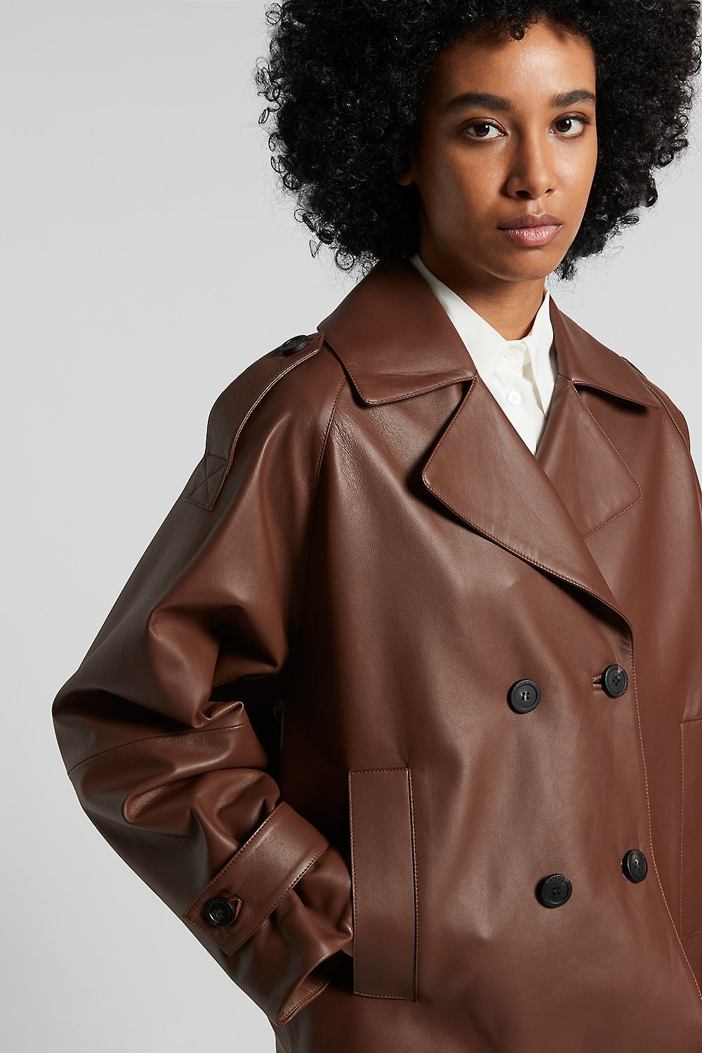 A masterpiece of style and craftsmanship, this short trench coat in soft lambskin leather elevates the concept of contemporary luxury.